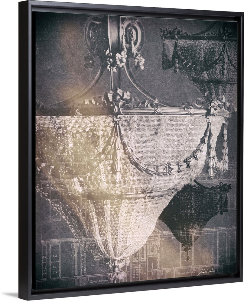<p>Contemporary artwork of crystal chandelier in a collage, with an architectural drawing in the background of the image.</p>