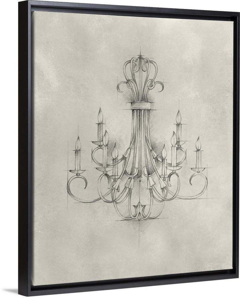 <p>This artwork features a drawing of a decorative chandelier with framework lines and cross hatching against a mottled background.</p>