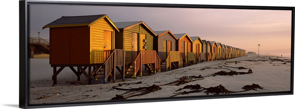 <p>A panoramic photograph of a row of buildings built on the sandy shoreline glowing in the light of sunset.</p>