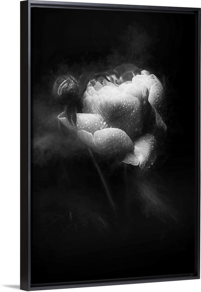 <p>Soft focus black and white image of a rose covered in water droplets and smoke around the sides giving it a dreamy look.</p>
