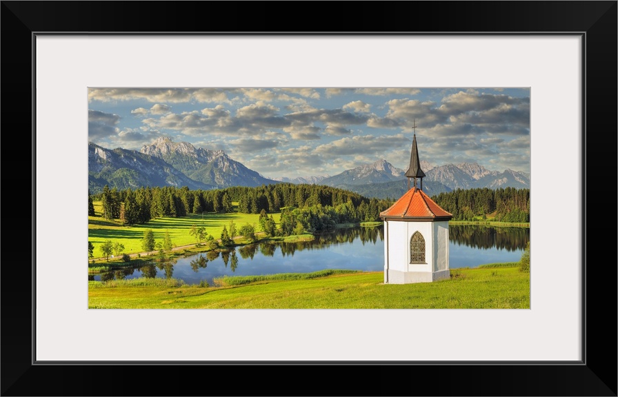 <p>Chapel at Hergratsrieder See Lake, Allgau, Swabia, Bavaria, Germany.</p>