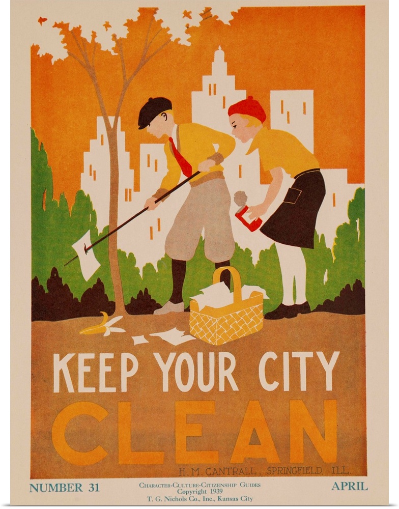 <p>1939, illustrated by H M Cantrall, young boy and girl pick up litter in city park with skyline and skyscrapers in the background,</p>