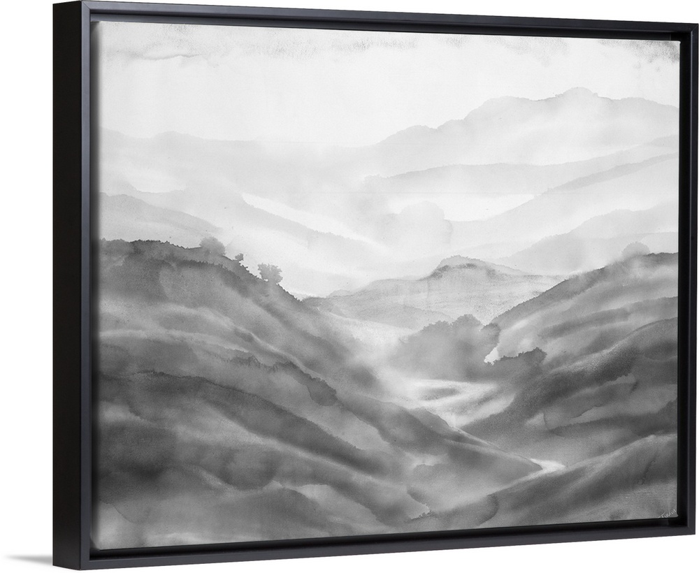 <p>Black and white abstract painting of rolling hills created with contrast.</p>
