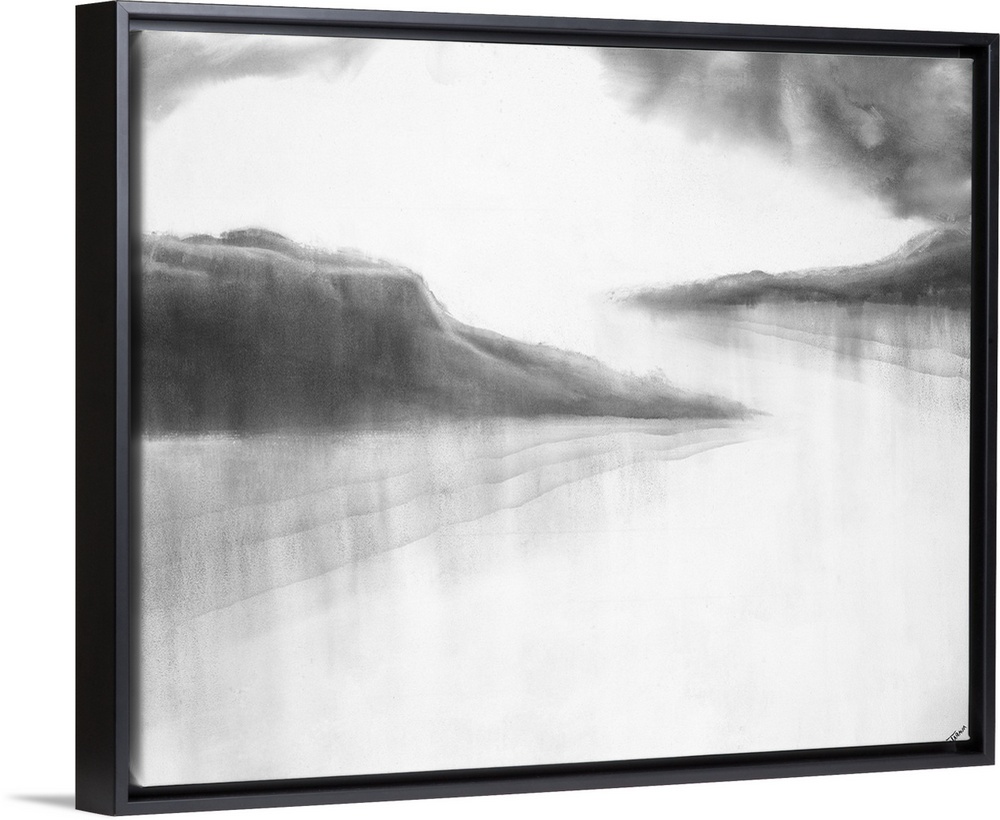 <p>Black and white abstract landscape painting with contrasting rock formations and clouds to the white skies and water.</p>