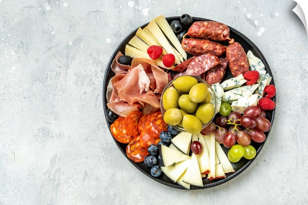 <p>Charcuterie board with Italian salami, prosciutto, various cheeses, and olives. Grapes, snacks in the restaurant for an aperitif or a family dinner. Rome, Italy.</p>