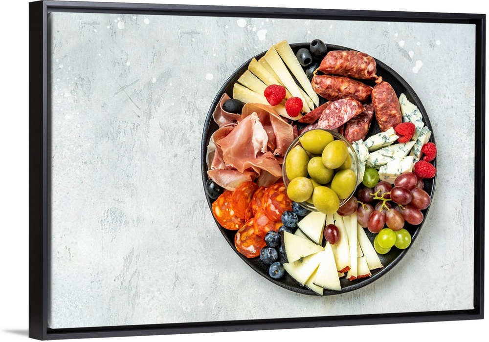 <p>Charcuterie board with Italian salami, prosciutto, various cheeses, and olives. Grapes, snacks in the restaurant for an aperitif or a family dinner. Rome, Italy.</p>