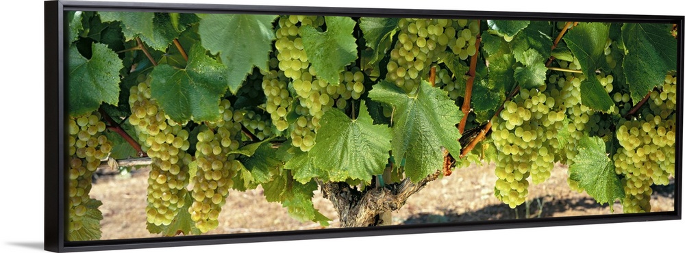 <p>Panoramic shaped wall art for wine aficionados, wine shops, or vineyards this long wall hanging is a close up photograph of white grapes growing on the vine.</p>