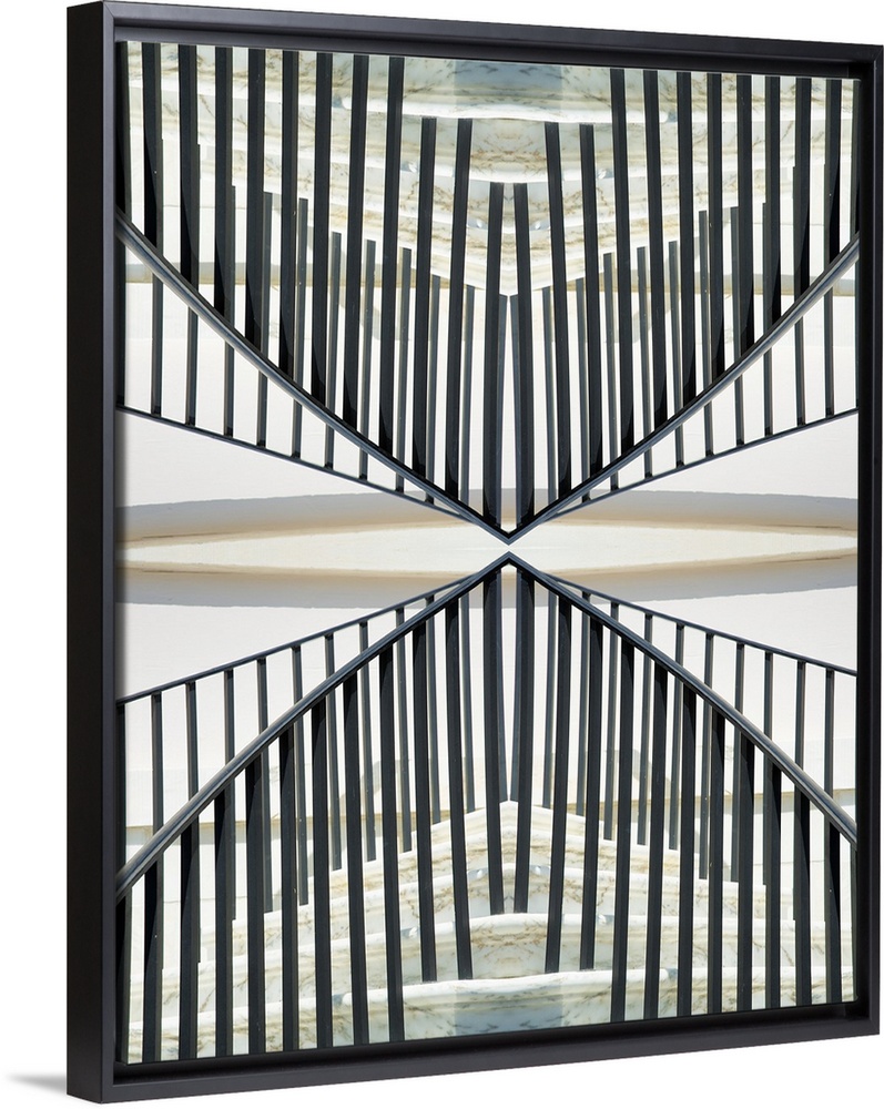 <p>An Escher-like abstract geometric photograph of a Charleston South Carolina church stairway using a kaleidoscopic technique and featuring elegant curving lines of black silver and gray against a creamy background.</p>