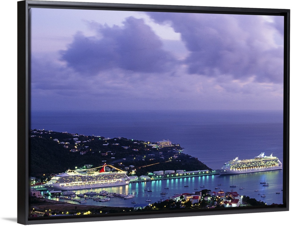 <p>This decorative wall art is a landscape photograph of tourist cruise ships docking in a Caribbean harbor at twilight.</p>