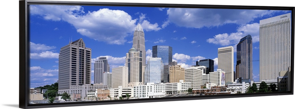 <p>Puffy clouds float above modern skyscrapers in a skyline of the most populous city in North Carolina.</p>