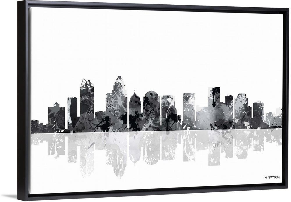 <p>Contemporary black and white watercolor skyline casting a mirror-like reflection below.</p>