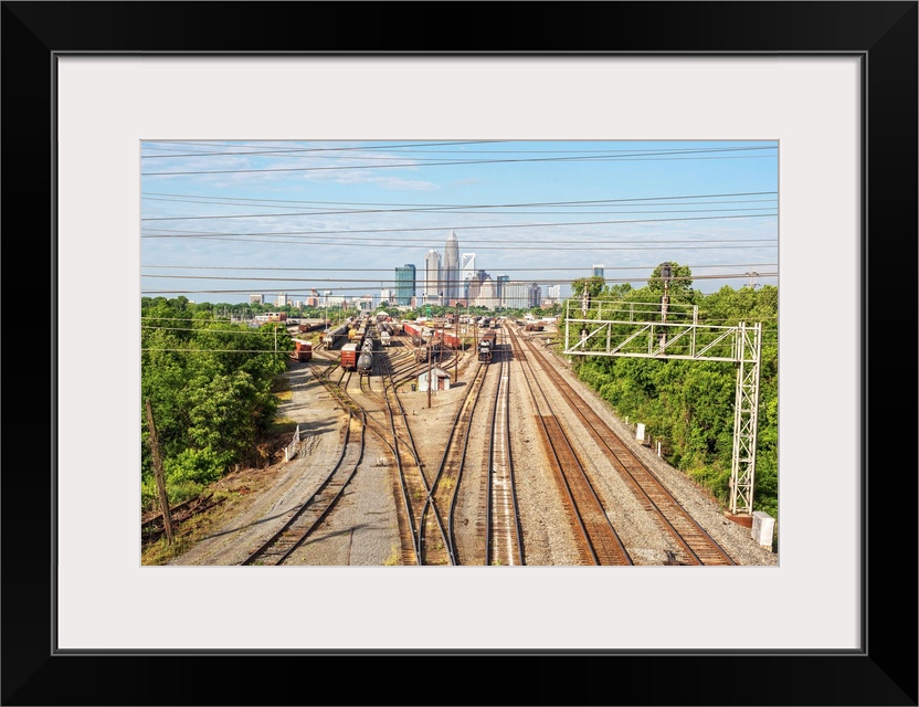 <p>A freight train leaving the city of Charlotte, North Carolina.</p>
