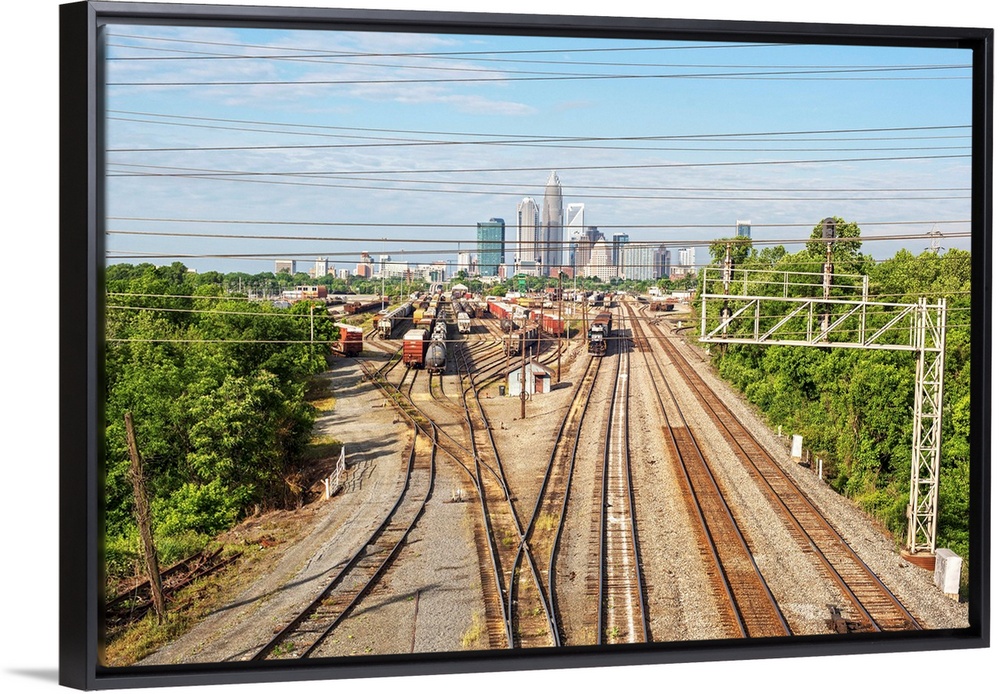 <p>A freight train leaving the city of Charlotte, North Carolina.</p>