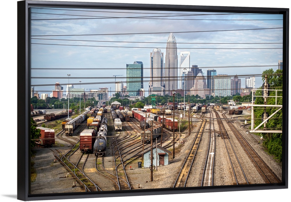 <p>A freight train leaving the city of Charlotte, North Carolina.</p>