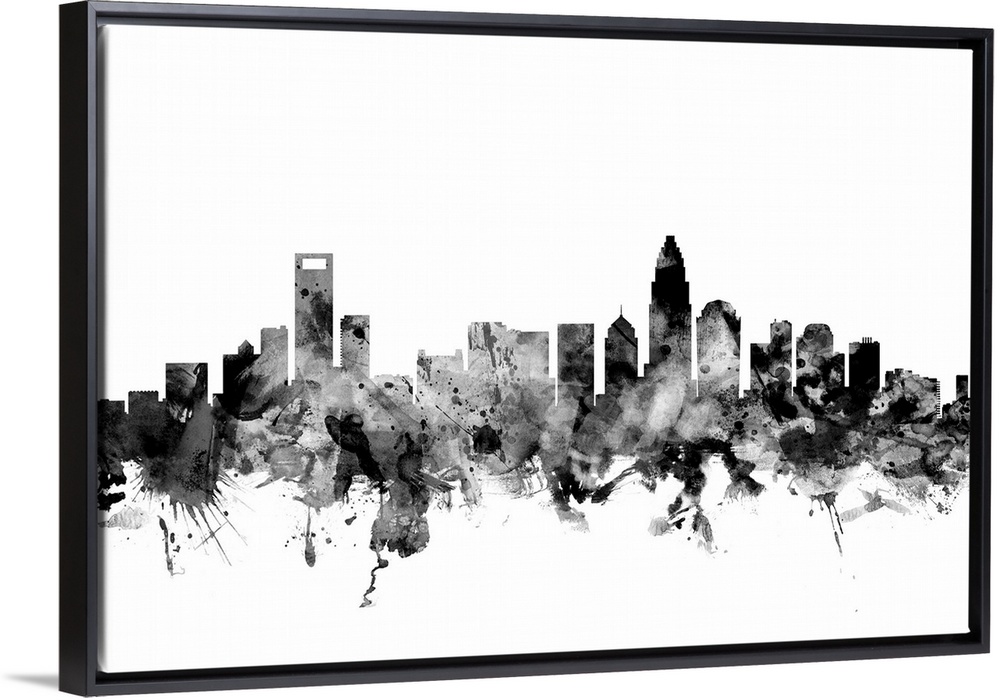<p>Contemporary artwork of the Charlotte city skyline in black watercolor paint splashes.</p>