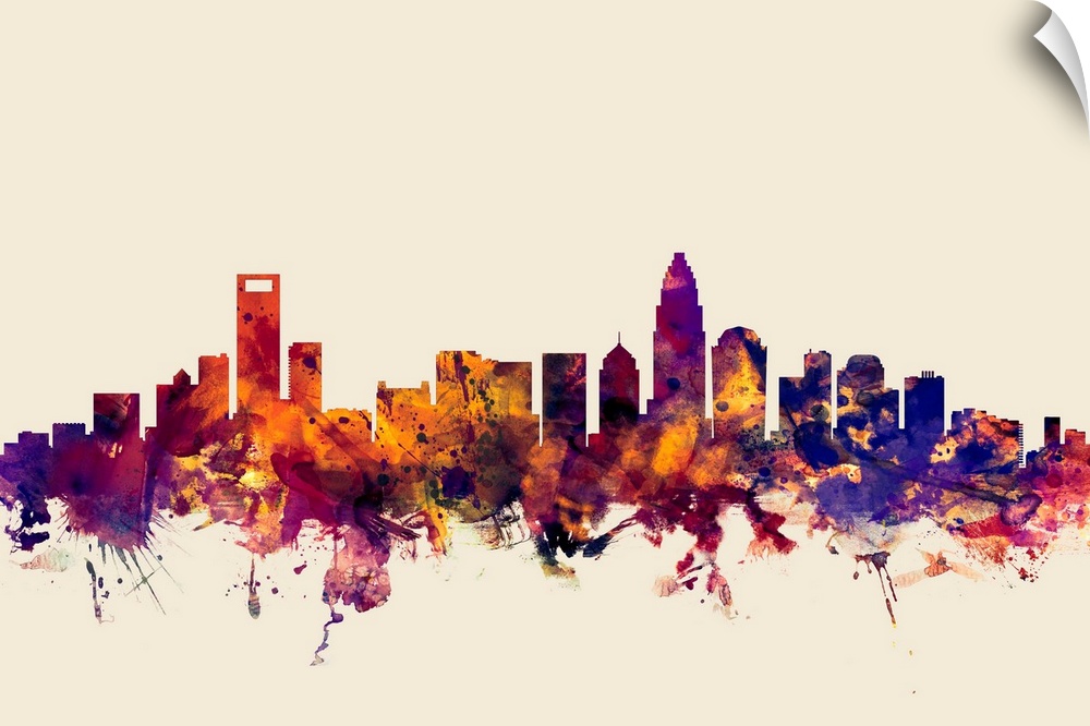 <p>Dark watercolor splattered silhouette of the Charlotte city skyline.</p>