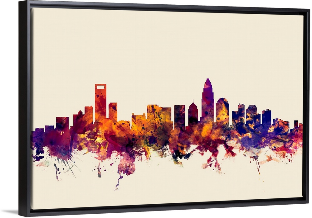 <p>Dark watercolor splattered silhouette of the Charlotte city skyline.</p>