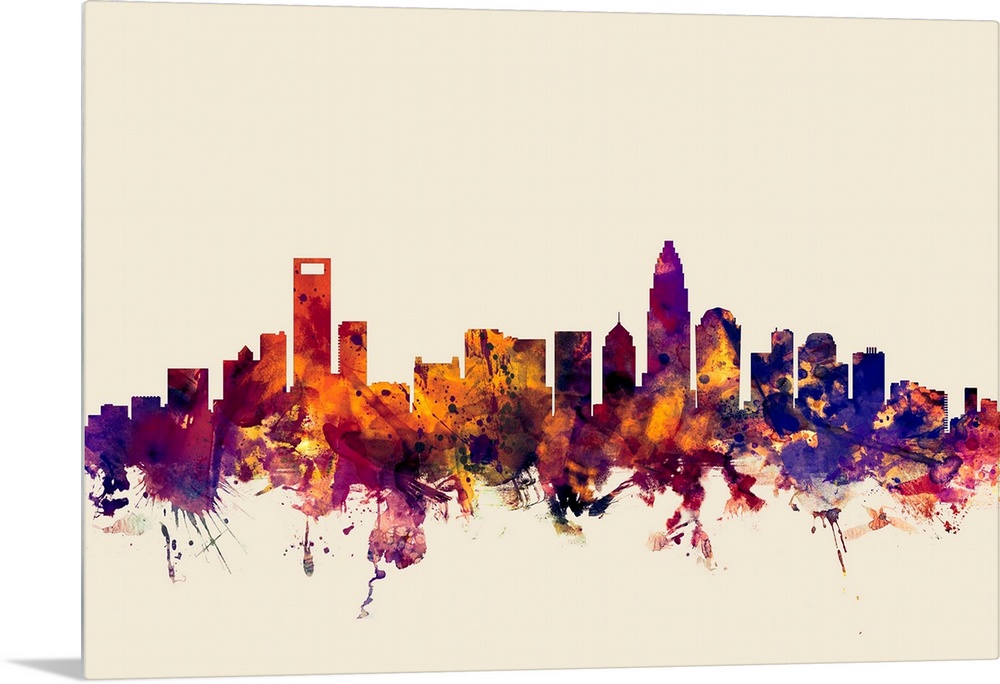 <p>Dark watercolor splattered silhouette of the Charlotte city skyline.</p>
