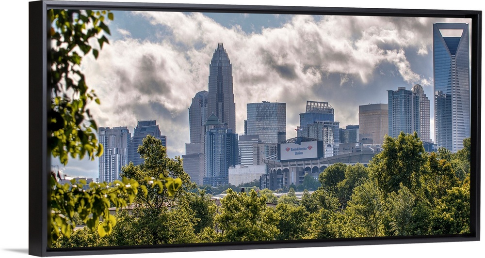 <p>A forest of trees in the foreground of the Charlotte North Carolina city skyline.</p>