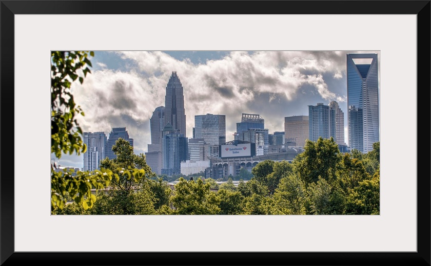 <p>A forest of trees in the foreground of the Charlotte North Carolina city skyline.</p>