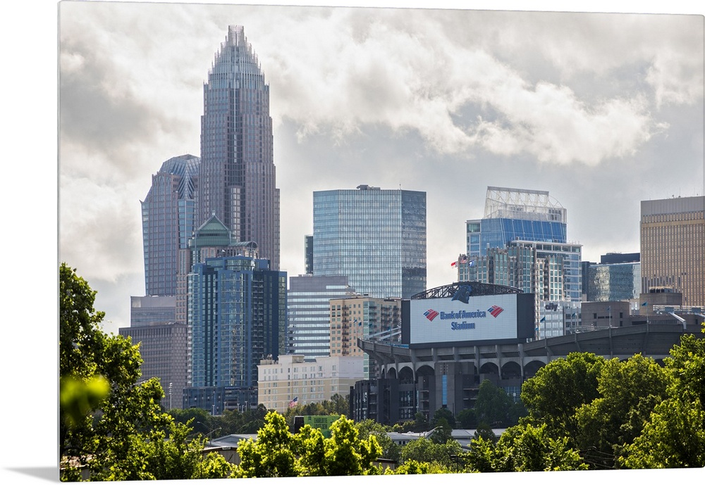 <p>A forest of trees in the foreground of the Charlotte North Carolina city skyline</p>