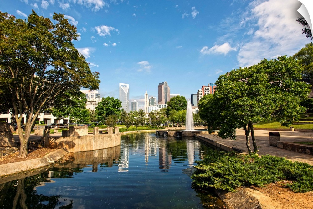 <p>A water fountain in the foreground and Charlotte skyline in the background.</p>