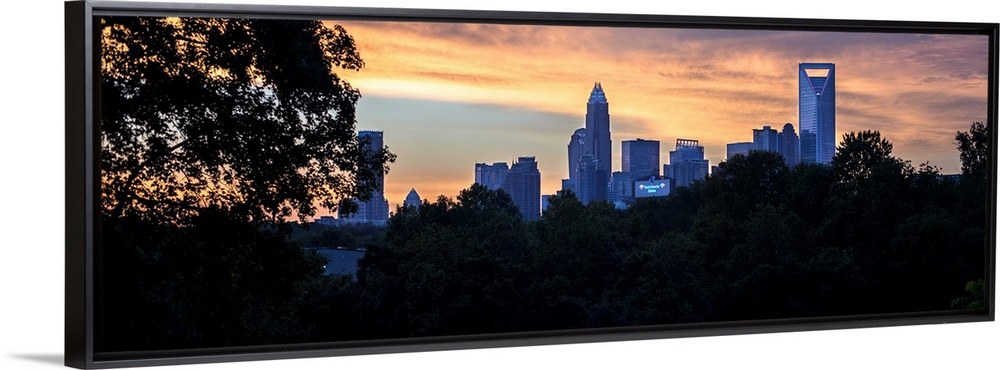 <p>The city of Charlotte, North Carolina at sunset with a forest of trees in the foreground.</p>