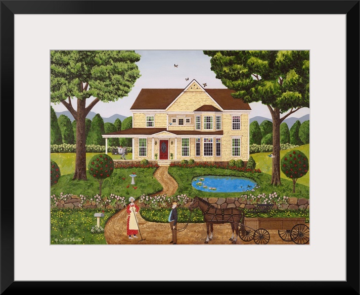 <p>Americana scene of a woman greeting a man with a horse and cart in front of her house.</p>
