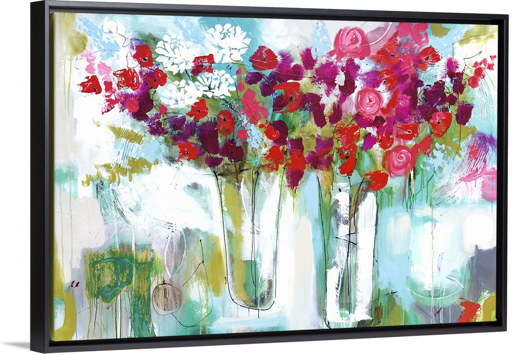 <p>A horizontal abstract floral painting of red roses and white flowers in two vases on a textured background.</p>