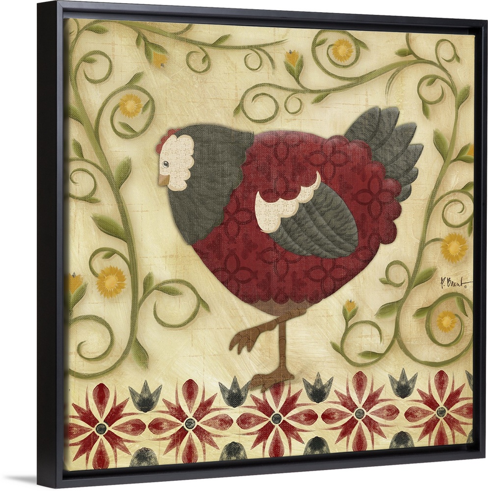 <p>Folk art style illustration of a hen surrounded by curling vines.</p>
