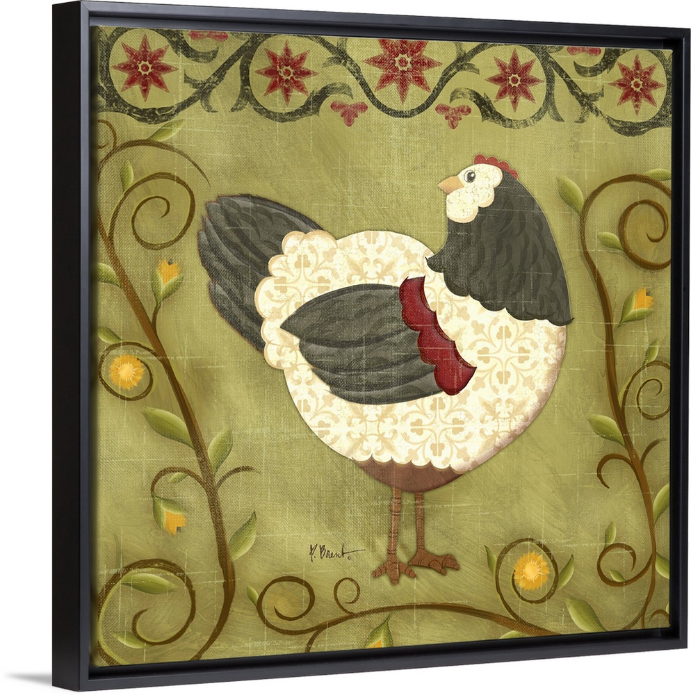 <p>Folk art style illustration of a hen surrounded by curling vines.</p>