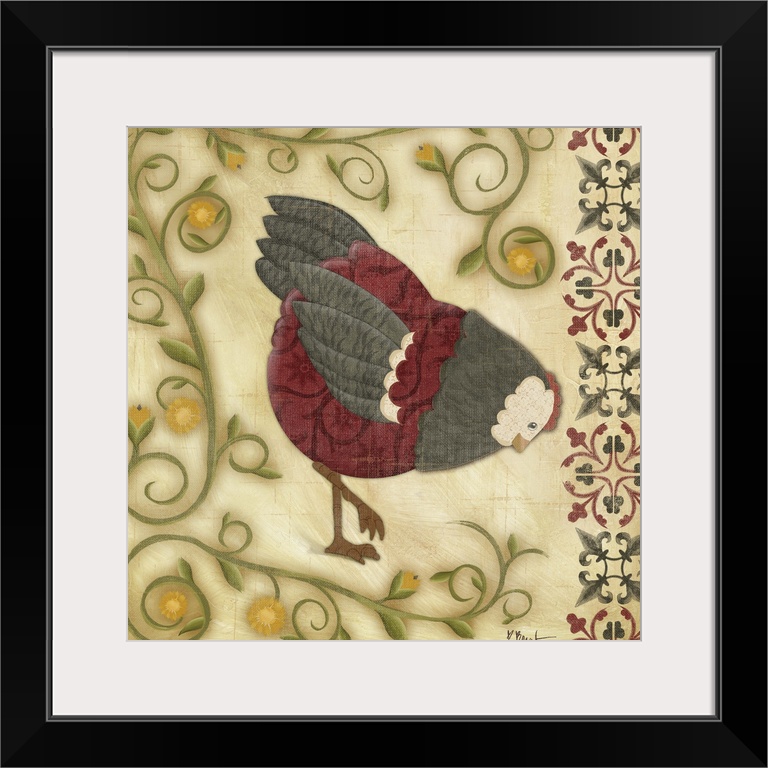 <p>Folk art style illustration of a hen surrounded by curling vines.</p>