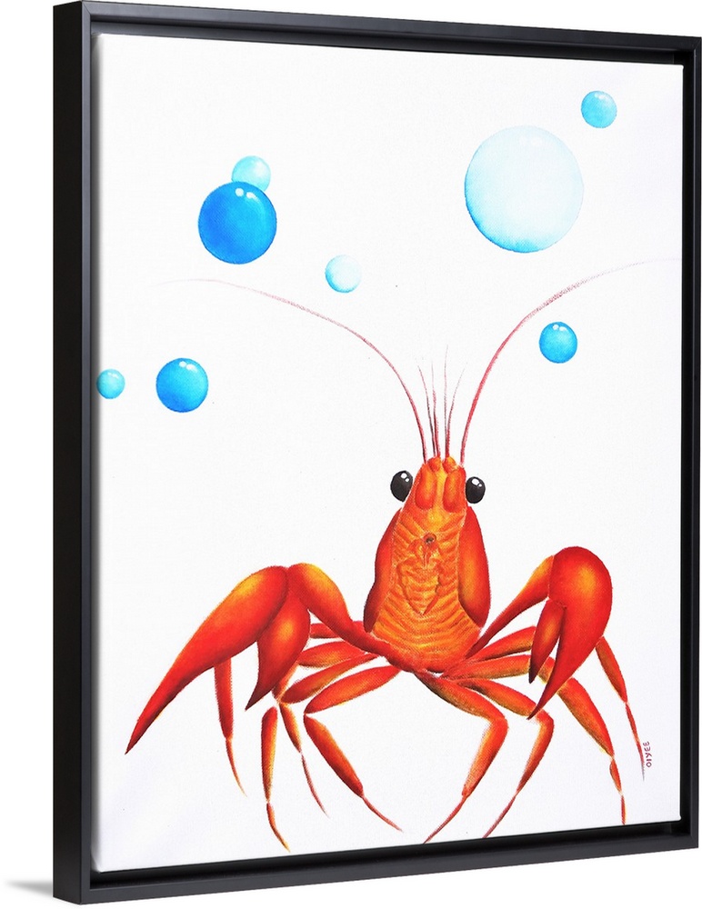 <p>Contemporary painting of a brightly colored lobster and blue bubbles above.</p>