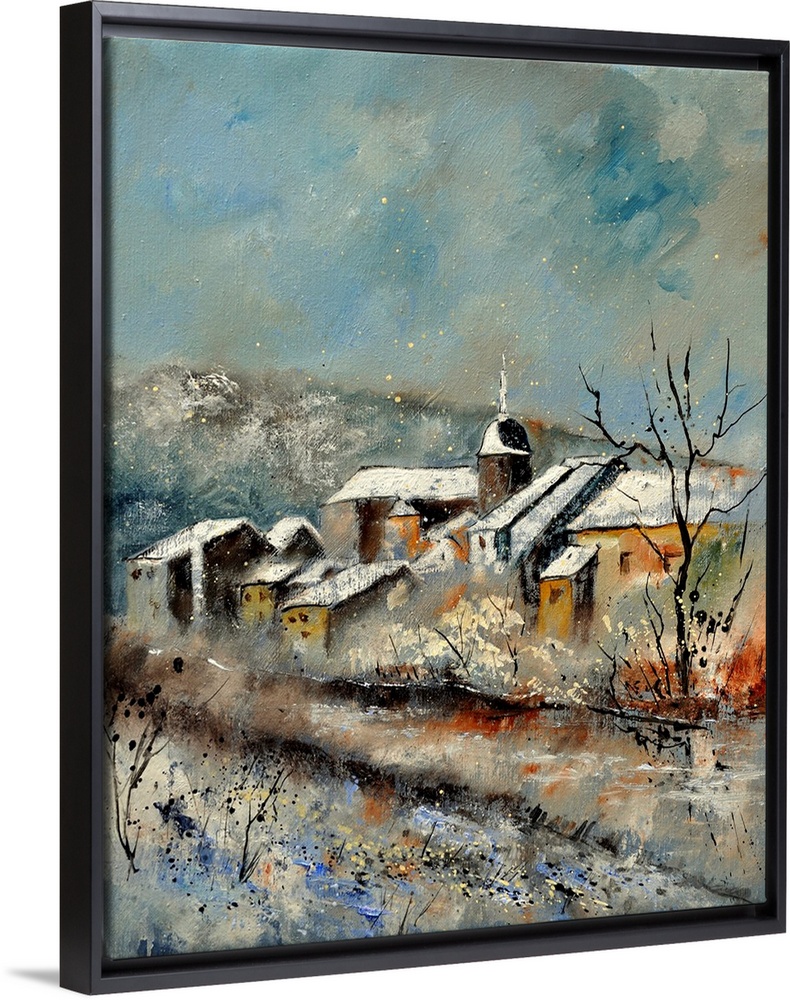 <p>Vertical painting of the village of Chassepierre, Belgium covered in snow.</p>