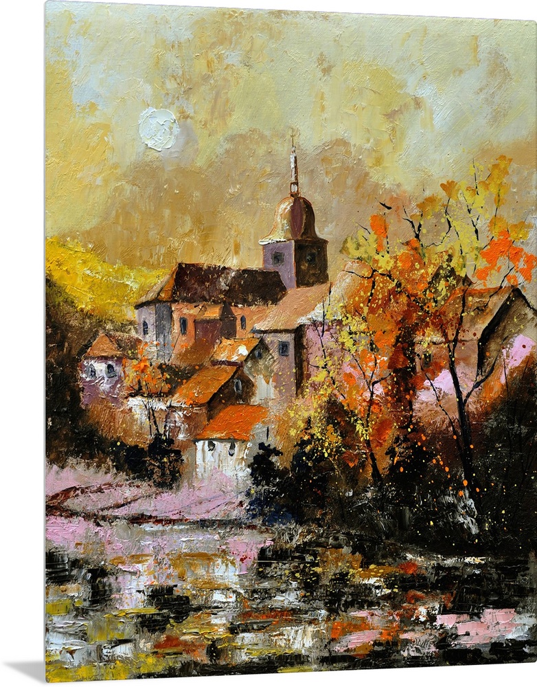 <p>Vertical painting of an Autumn landscape with flowers in the foreground and a Belgium village in the background.</p>