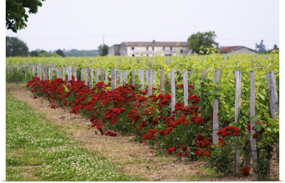 <p>Chateau Bourgneuf Vayron vineyard with intensely red rose bushes at the end of each row of vines Pomerol Bordeaux Gironde Aquitaine France</p>