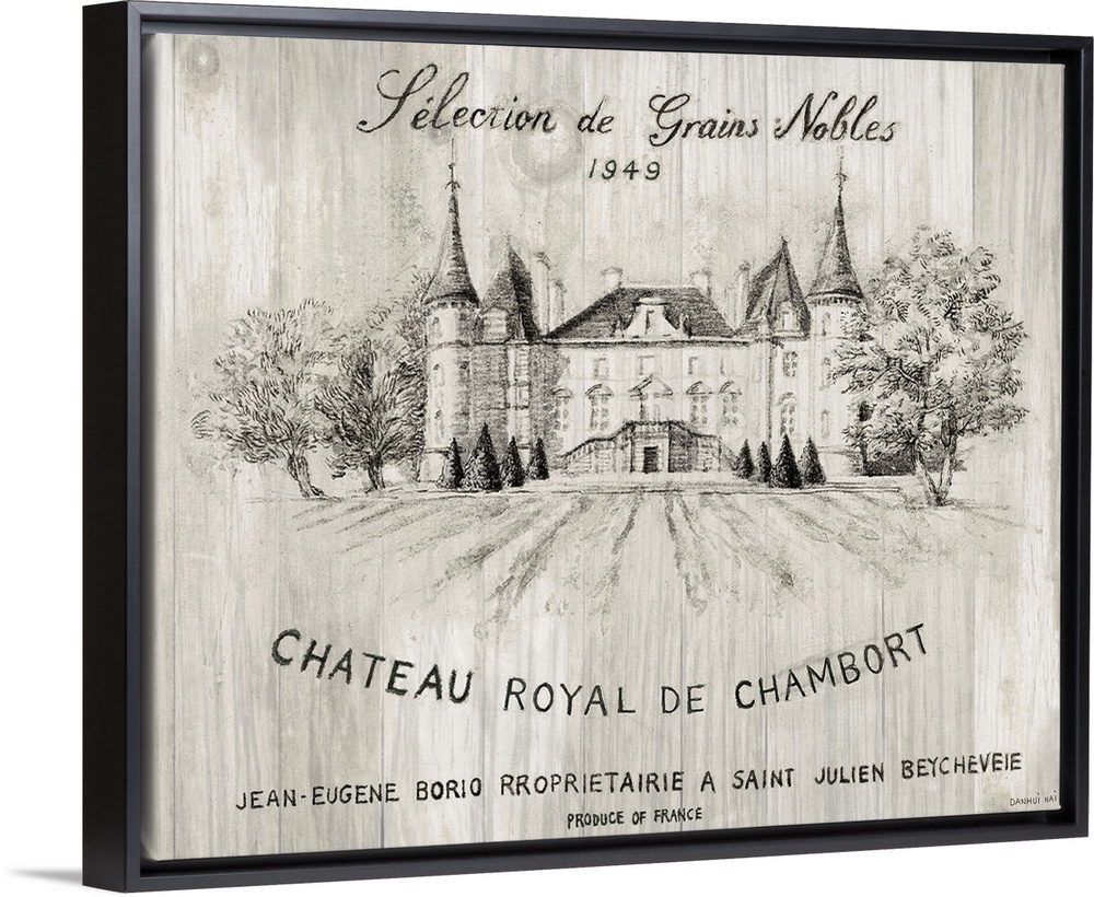 <p>Gray and white sketch of the Chateau Royal De Chamborat vineyard on wood panels.</p>