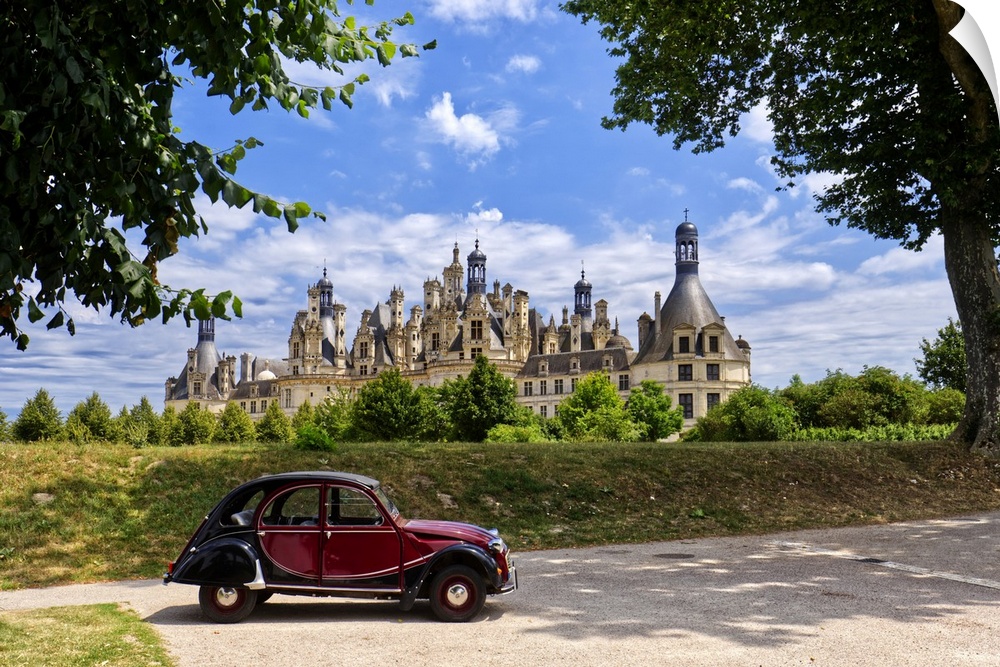 <p>France, Centre-Val de Loire, Valle della Loira, Loir-et-Cher. Castello di Chambord, Chateau de Chambord-View of the Castle built in year 1519 by French King Francois I. Typical french vinte car.</p>