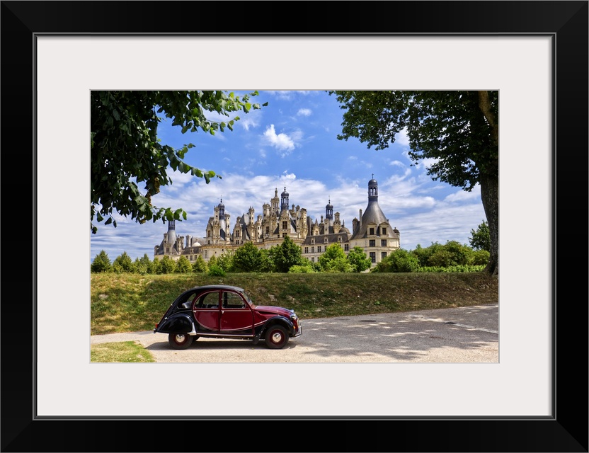 <p>France, Centre-Val de Loire, Valle della Loira, Loir-et-Cher. Castello di Chambord, Chateau de Chambord-View of the Castle built in year 1519 by French King Francois I. Typical french vinte car.</p>
