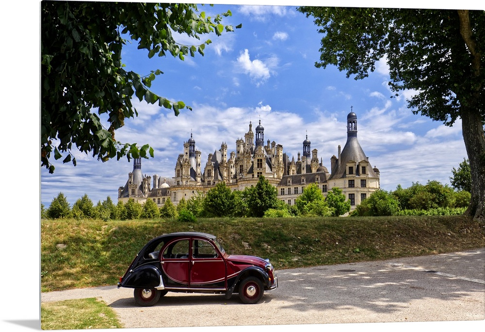 <p>France, Centre-Val de Loire, Valle della Loira, Loir-et-Cher. Castello di Chambord, Chateau de Chambord-View of the Castle built in year 1519 by French King Francois I. Typical french vinte car.</p>