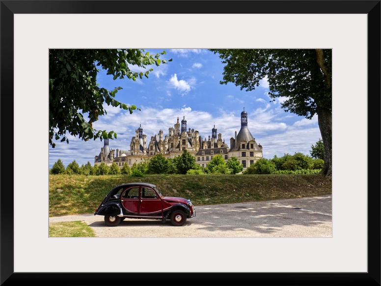 <p>France, Centre-Val de Loire, Valle della Loira, Loir-et-Cher. Castello di Chambord, Chateau de Chambord-View of the Castle built in year 1519 by French King Francois I. Typical french vinte car.</p>