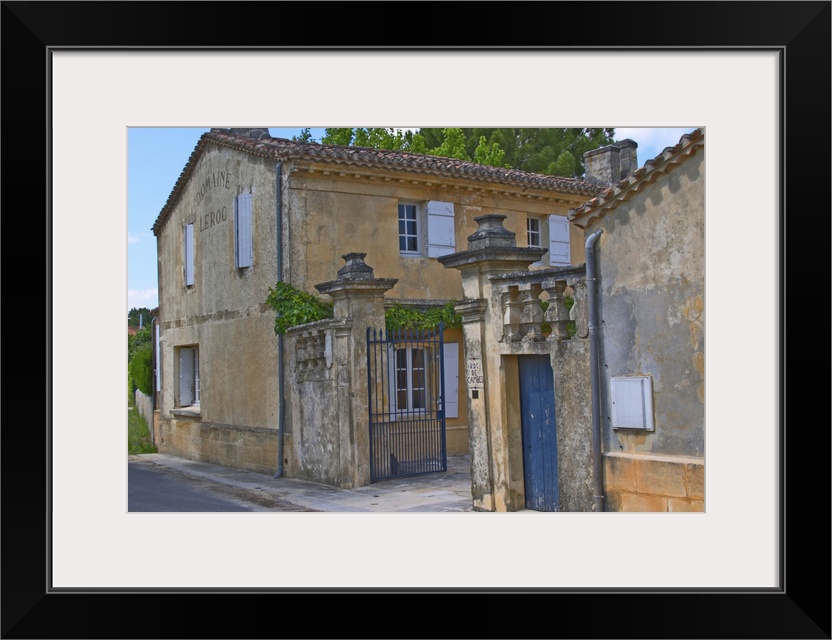 <p>The Chateau Roc de Cambes with stone wall iron gate and stone gate posts with the name carved. Blue doors and yellow house Cotes de Bourg Bordeaux Gironde Aquitaine France</p>