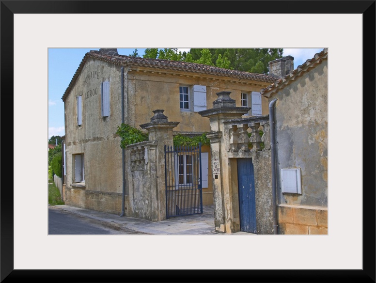 <p>The Chateau Roc de Cambes with stone wall iron gate and stone gate posts with the name carved. Blue doors and yellow house Cotes de Bourg Bordeaux Gironde Aquitaine France</p>