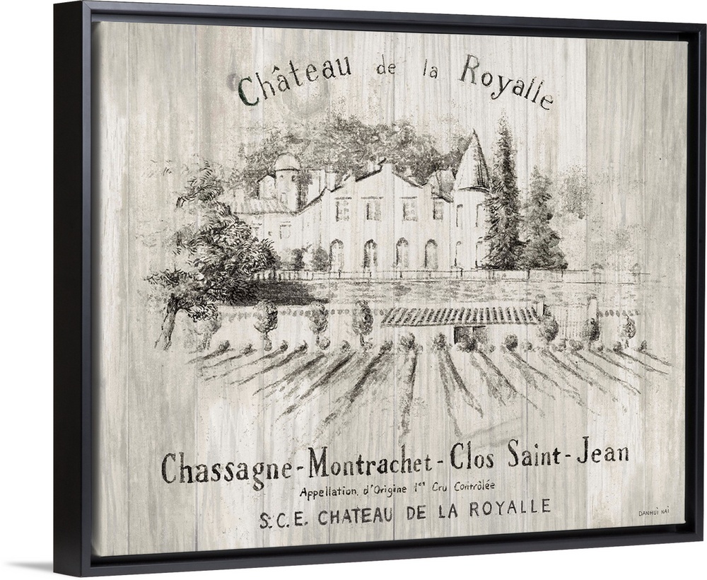 <p>Gray and white sketch of the Chateau Royalle vineyard on wood panels.</p>