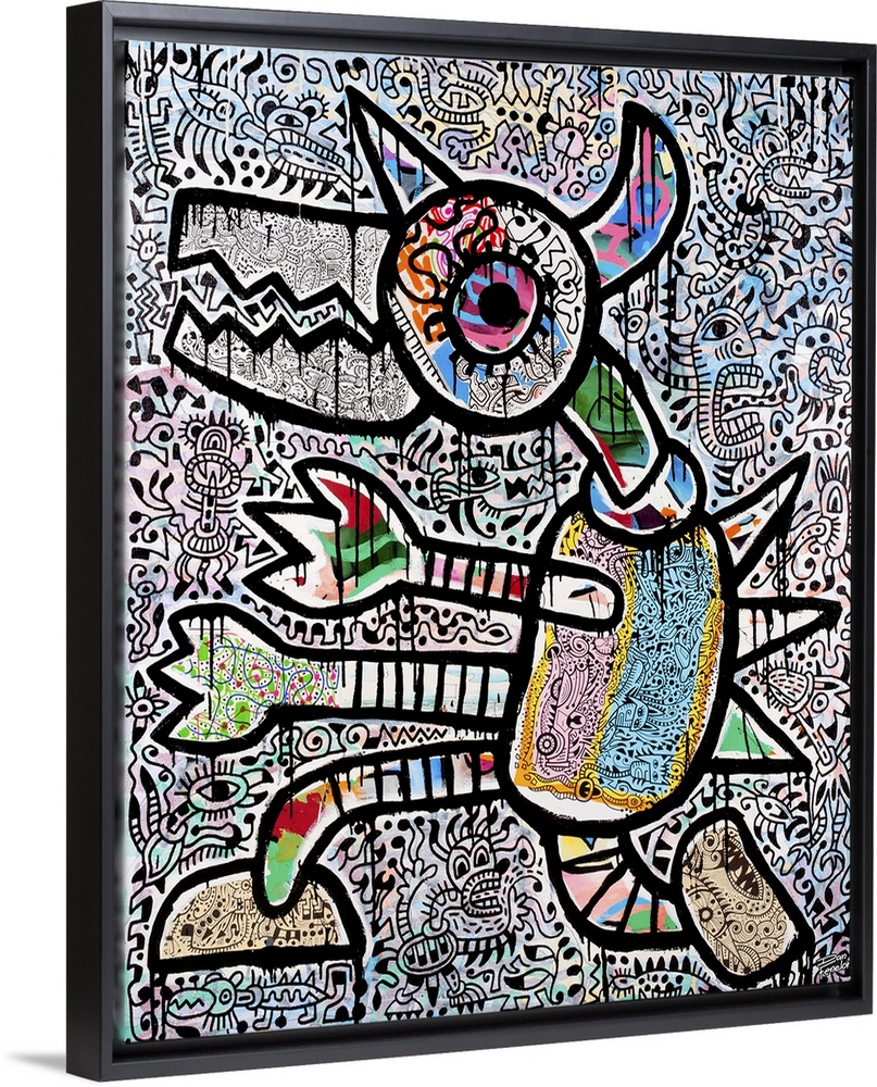 <p>Contemporary abstract painting of a monster in bright colors and patterns, against a detailed abstract background.</p>