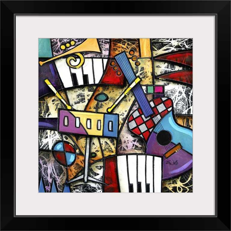 <p>Large, square contemporary artwork of a vibrant grouping of various musical instruments, including a guitar, piano, and trumpet, all on a background of colorful shapes and light scribbles on a dark background.</p>