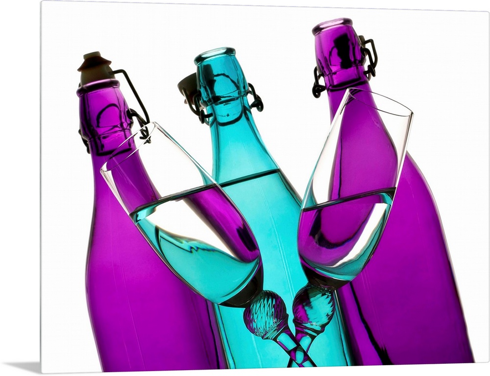 <p>turquoise and purple glass bottles with two champagne flutes crossing in front on a white background.</p>
