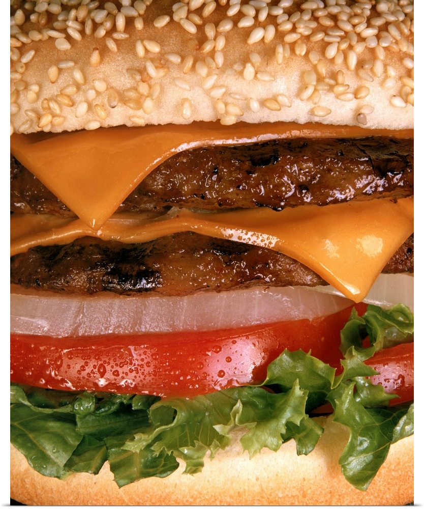<p>Big vertical close up photograph of a juicy tow layered cheeseburger with onion, tomato and lettuce on a sesame seed bun.</p>