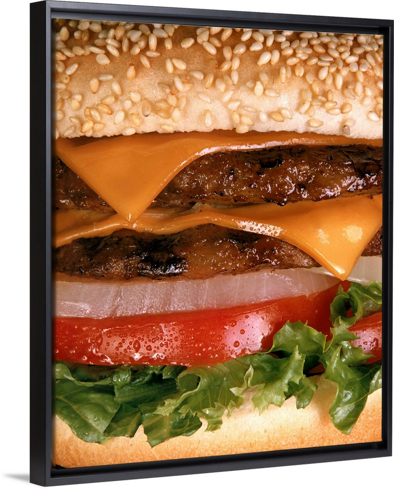 <p>Big vertical close up photograph of a juicy tow layered cheeseburger with onion, tomato and lettuce on a sesame seed bun.</p>