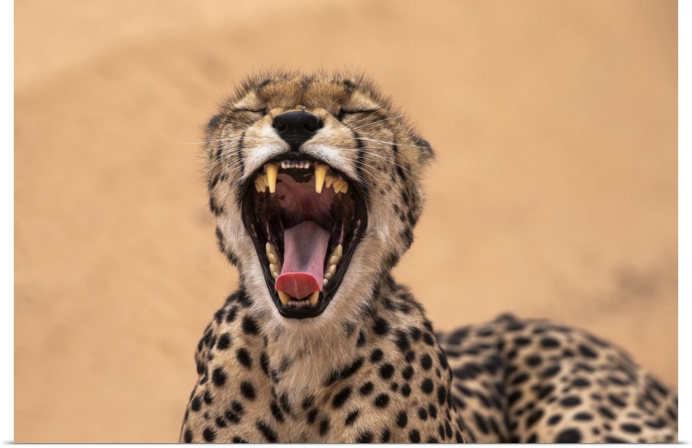 <p>Cheetah (Acinonyx jubatus) yawning, Kgalagadi Transfrontier Park, South Africa, Africa</p>